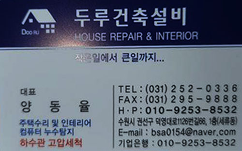 두루건축설비 홈페이지가 준비되었습니다. 페이지 정보 작성자.관리자 작성일18-11-29 17:02 조회530회 댓글0건 목록 본문 하수구막힘,뚫음 시원하게 해결해드립니다. 문의주세요. 댓글목록 등록된 댓글이 없습니다. 목록